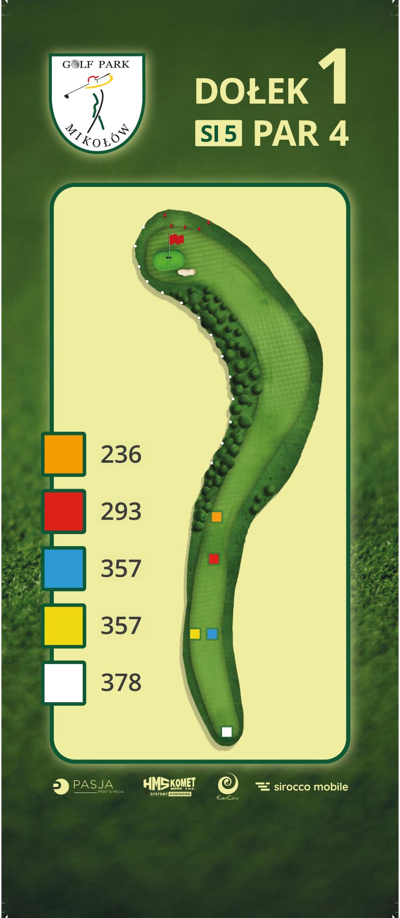 D1Pierwszy dołek na polu jest bardzo dobry na rozgrzewkę. Jest to dogleg zakręcający lekko w lewo w końcowej jego część. Szeroki fairway w początkowej części biegnie dość mocno pod górę, przez co z tee nie widać flagi. Wychodząc z tee driverem należy, więc zwrócić uwagę na poprawny kierunek uderzenia. Najlepiej umieścić piłkę na środku lub nawet po prawej stronie fairwaya, dzięki temu podejście na green nie będzie zakłócone przez drzewka i bunkier. Green dość mały, ale prosty i równy z lekkim spadkiem na prawo i do tyłu.
