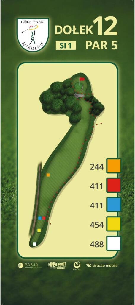D12Wymagający dołek grany najpierw w dół, potem pod górę. Zalecane precyzyjne trzecie uderzenie po prawej stronie przecinki w okolice czerwonego kołka odległościowego 100 m. Z tej pozycji dokładny lob na greena pozwoli na zrobienie dobrego wyniku. Wyniesiony wysoko, pofałdowany green nie ułatwia zadania. Piękna panorama dla stojących na greenie jest urokliwym dodatniem dla wszystkich