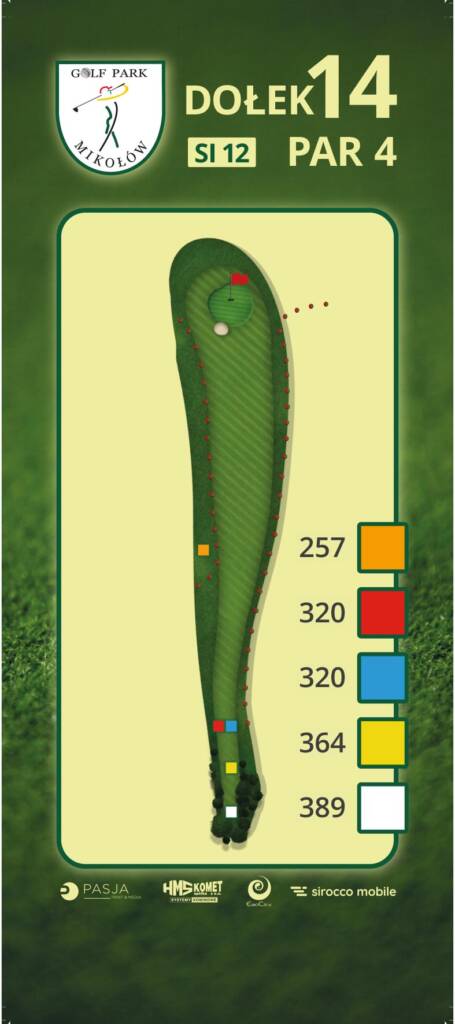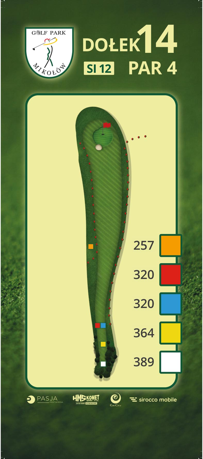 D14Piękny widok na dołki 12 do 16 i szeroki fairway 14-stki pokazuje, że najgorsze mamy za sobą. Łagodne zejście w dół i duży płaski green z małym bunkrem przy jego lewej krawędzi daje możliwość zrobienia dobrego wyniku.