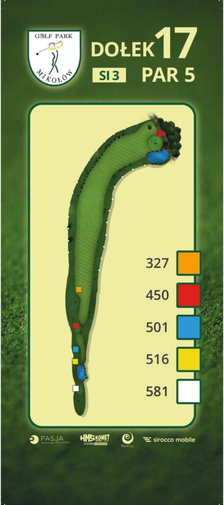 D17Najdłuższy par 5 na polu. Tylko dobry drive oraz długie i poprawne drugie uderzenie daje szansę zobaczenia dużego, płaskiego greena i wejście w regulacji. Po lewej stronie greena dwa małe zagłębienia z wodą