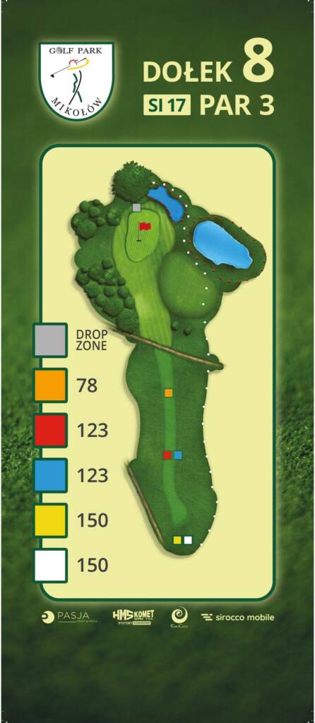 D8Ósmy dołek to piękny widok na jezioro, green i drzewa za nim. Dołek jest równie ładny co wymagający.