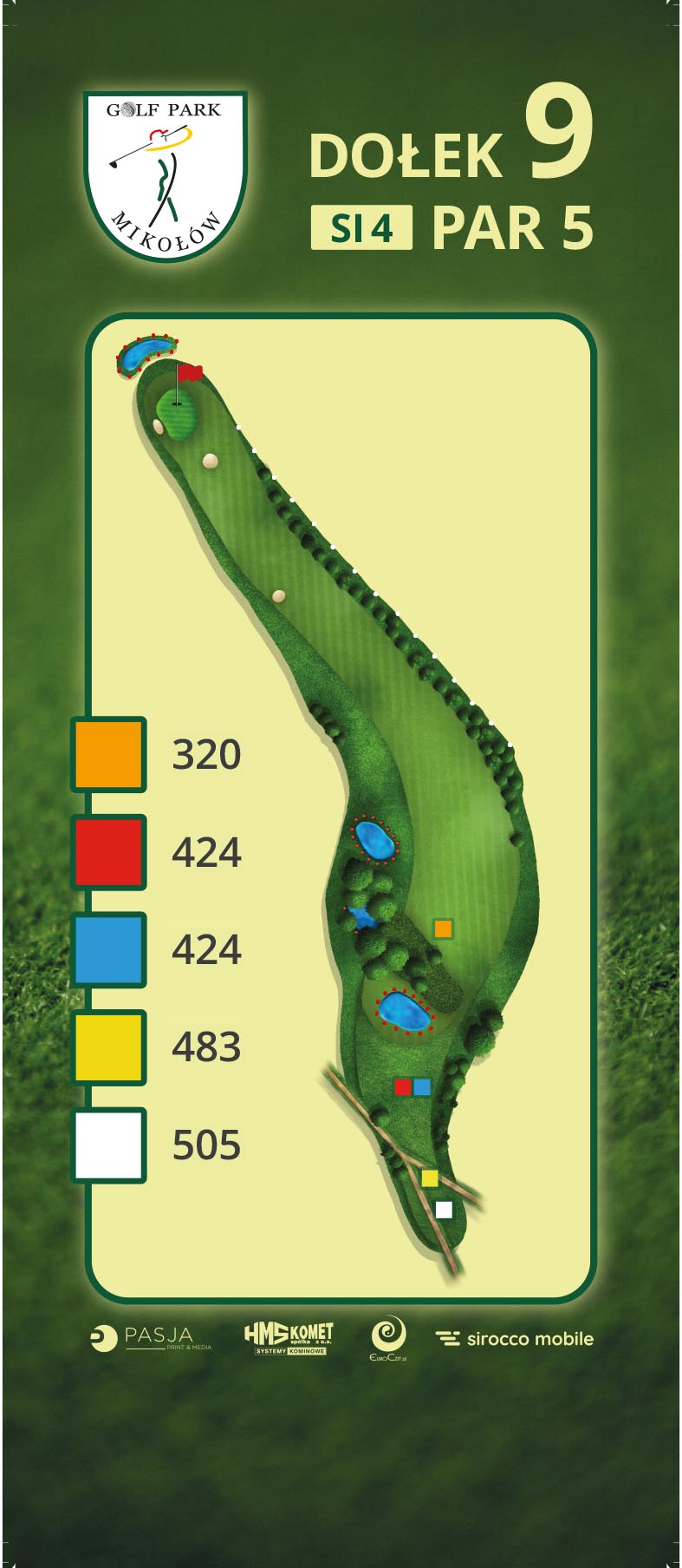 D9Na zakończenie Twórcy pola przygotowali kolejny ciekawy dołek. Ponownie dogleg w lewo, tym razem z mocnym wygięciem. Pierwszą opcją, którą gracz ma do wyboru jest zagranie wysoko nad drzewami, co pozwoli zyskać kilkadziesiąt metrów i myśleć o birdie. Drugą opcją jest draw zagrany nad jeziorem z prawej strony drzewa.